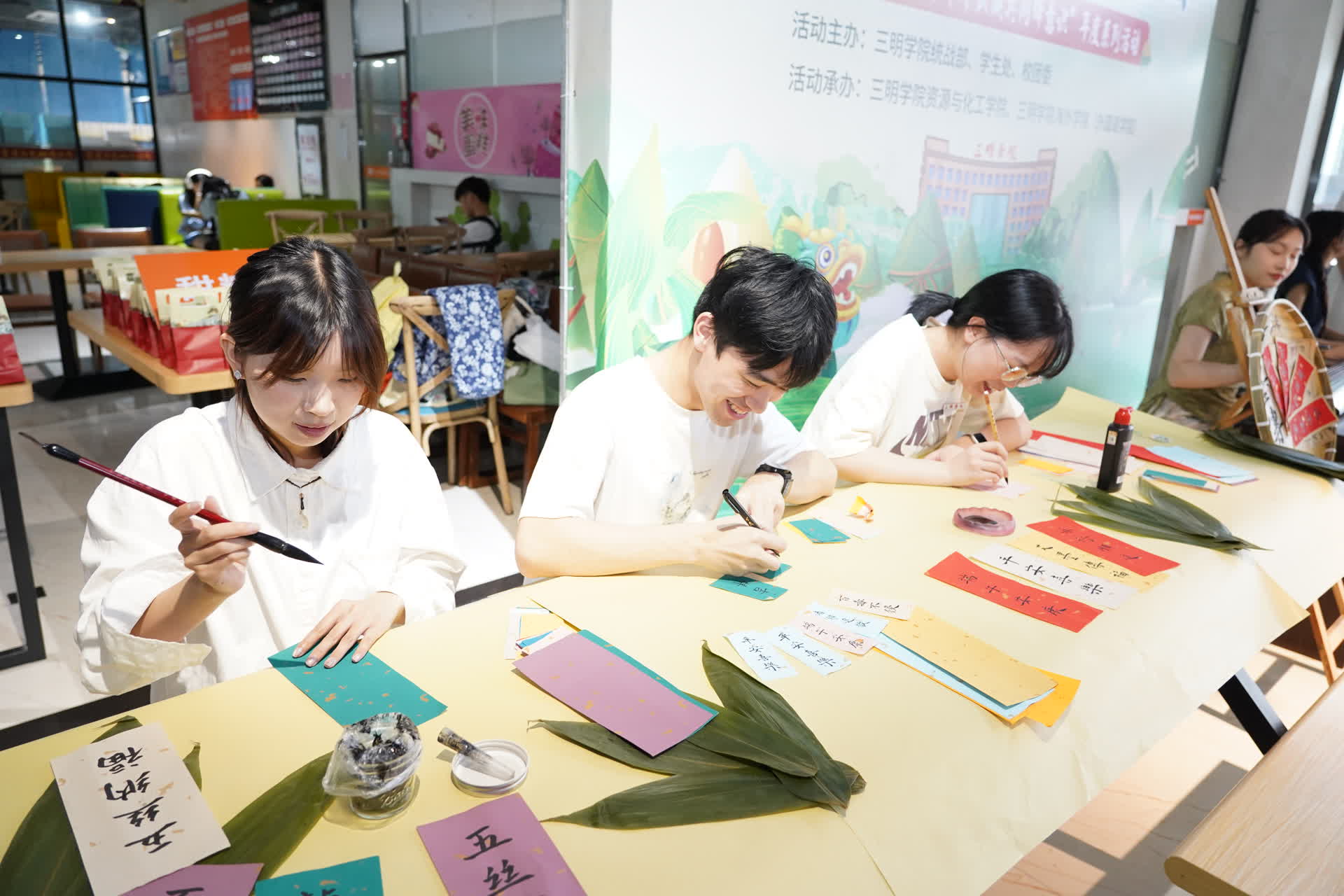 活动现场精心设置了五大主题体验区。雅乐品茗区以古琴雅乐、茶艺展示营造诗意氛围;艾墨传福区以粽叶为纸书写端午祝福;囊纳五瑞区、蒲艾盈馨区将民俗与创意结合,供师生制作香囊、艾草花束。最热闹的粽意工坊区里,师生在食堂师傅指导下,热情体验包粽子乐趣,在动手实践中感受节日温情与文化传承。