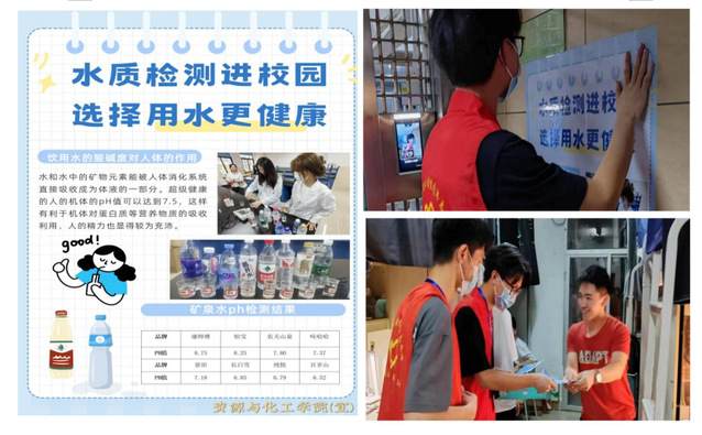 饮用水的酸碱度对人体酸碱平衡的维持有着重要的影响。在生活中,同学们可以根据自身体质选择适合自己的饮用水,选择饮用弱酸性或弱碱性饮用水,调节人体的酸碱度来保证自身身体健康。为帮助同学们了解校园超市内不同种类矿泉水的酸碱度。资源与化工学院学生利用专业知识和实验操作,完成检测校园超市各类矿泉水的酸碱度。检测结束后,深入一站式学生社区对检测结果进行宣传,进入学生宿舍开展分发传单、宣讲等活动,为同学们普及基本饮水健康知识,传播绿色生活理念。