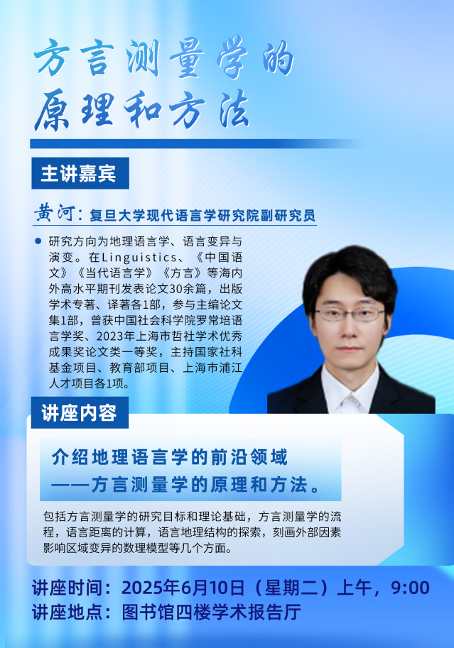 主讲人:黄河,复旦大学现代语言学研究院长聘副研究员,北京大学中文系文学博士。研究方向为地理语言学、语言变异与演变。在Linguistics、《中国语文》、《当代语言学》、《方言》等海内外高水平期刊发表论文30余篇,出版学术专著、译著各1部,参与主编论文集1部,曾获中国社会科学院罗常培语言学奖、2023年上海市哲社学术优秀成果奖论文类一等奖,主持国家社科基金项目、教育部项目、上海市浦江人才项目各1项。