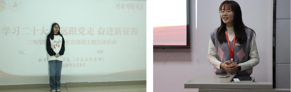 本次宣讲活动邀请到了校宣讲团成员苏丽莺、丛佳欣、黄倩、郑满意、苏芸茹、张钰宁、黄梦妍、王娴同学以及教育与音乐学院各专业班级代表。分别向大家讲述“燃灯校长”张桂梅、带领村民创业致富的90后独臂女孩李敏、在平凡的岗位上创造不平凡价值的宋学文、用一生守护南海的王书茂等时代楷模的先进事迹。一段段声情并茂的宣讲,一个个感人至深的故事,同学们全神贯注,认真听讲,深刻感受到了自己身上沉重的使命感和社会责任感。