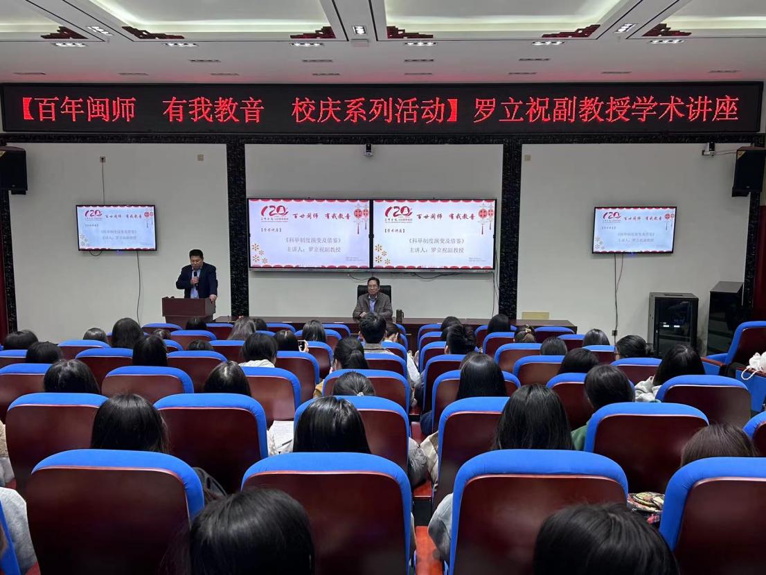 为庆祝taptap点点网站下载120周年华诞,营造良好的学术氛围,11月30日,我院特邀福建师范大学高考研究中心副主任、福建师范大学教育学院副教授罗立祝老师,于靖远楼101开展《科举制度演变及借鉴》学术讲座。讲座由教育与音乐学院院长艾述华老师主持。