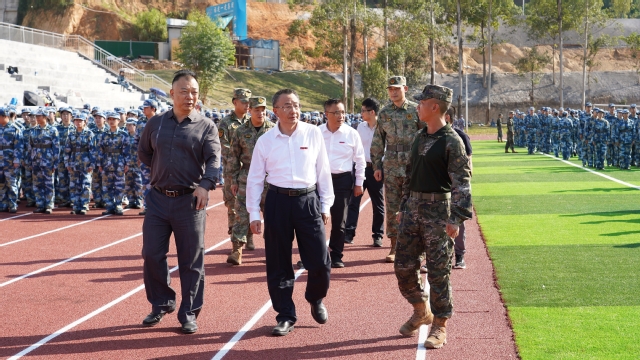 10月11日,校党委书记赖锦隆、校长张君诚前往南区田径场调研指导2024级学生军训工作。学生处、保卫处有关同志陪同。