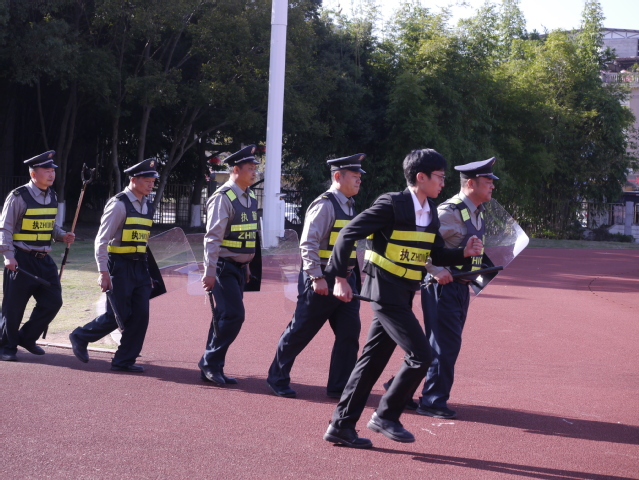 本次演练由防暴技战术展示和突发事件处置实战演练两部分组成。安保队员率先进行了防暴基础动作演示,该演示充分展现出安保人员的战斗力与良好精神风貌。突发事件演练根据事先设置好的背景情节进行实战演练,保卫处工作人员及安保队员根据突发事件应急预案,迅速出动,及时增援,通过有效的战术防御、控制阵型及协同配合,最终将“不法分子”成功擒获。