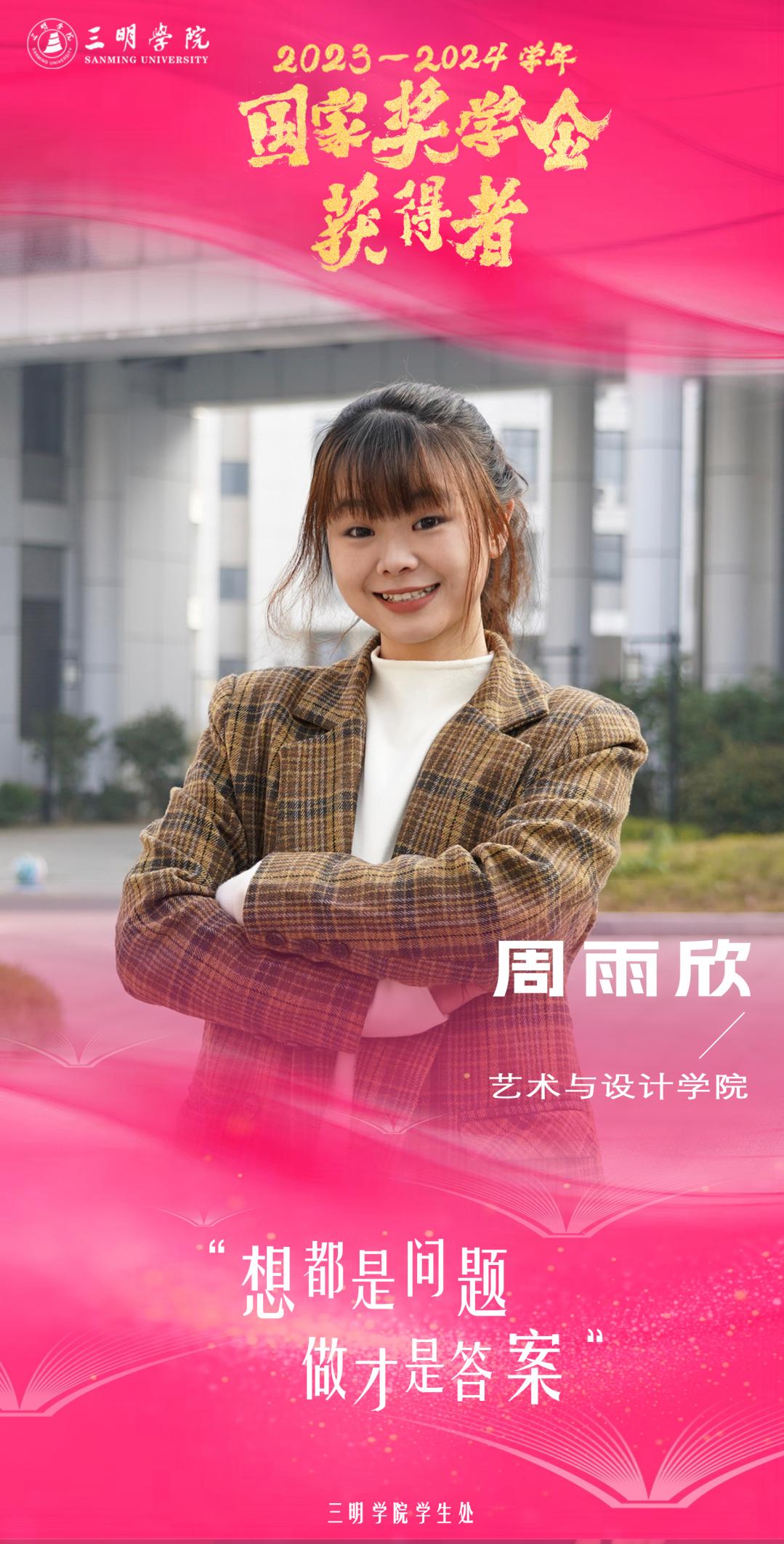 周雨欣,中共党员,艺术与设计学院2021级产品设计专业学生,曾担任校级摄影协会会长,班级宣传委员,灵犀聚创工作室成员。现任班级团支部书记。在校期间,连续三年获校级奖学金,获三好学生、优秀共青团干部等10余项荣誉称号,获第十届“创青春”中国青年创新创业大赛国赛铜奖、第九届福建省“互联网+”大学生创新创业大赛省赛铜奖等40多项赛事奖项,参与实用新型专利1项,主持校级大学生创新创业训练计划项目1项。