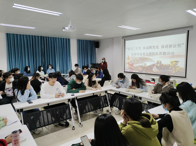 为引导党员同志把思想统一到党的二十大精神上来,进一步提高支部党员及积极分子学习的积极性和主动性,化学专业党支部组织全体党员及积极分子开展“新征程·党旗红”学习二十大精神组队答题活动,通过必答、抢答、竞猜等形式开展学习活动,提高学习效果,推动党的二十大精神往心里走、往实里走。