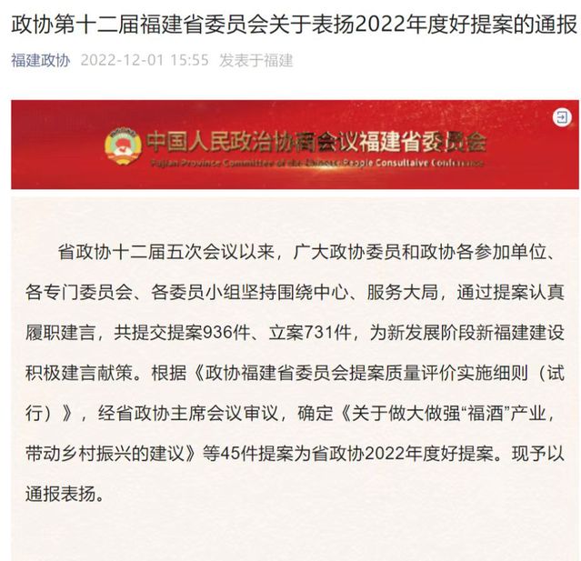 该提案入选福建省第十七届建言献策论坛评为二等奖,入选福建省政协十二届五次会议重要提案摘报,被确定为2022年省政协重要提案。