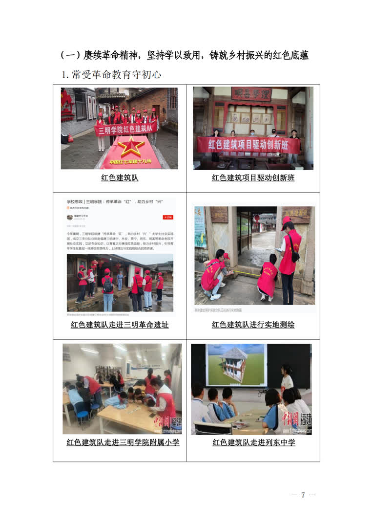 2.用好红色资源铸底色。长期的革命洗礼让支部深刻认识到红色是苏区老区乡村最厚重的底色。支部坚持党性教育与专业实践相结合,组建红色建筑队,将传统设计理念与现代人工智能、3D影像技术融合,实现红色资源三维再现,设计形成体现三明党史事件、红色资源、革命先辈等独特优势的红色IP,有效推动县域红旅产业发展;同时挖掘红色建筑的文化特色和精神特质,提炼红色建筑外观设计的内涵表达形态,推动红色文化实现创造性转化、创新性发展,让乡村的“苏区红”留得更久、传得更远,该项目获批建设福建省科技专项“福建红色建筑文化传承发展与数字化服务基地”项目。