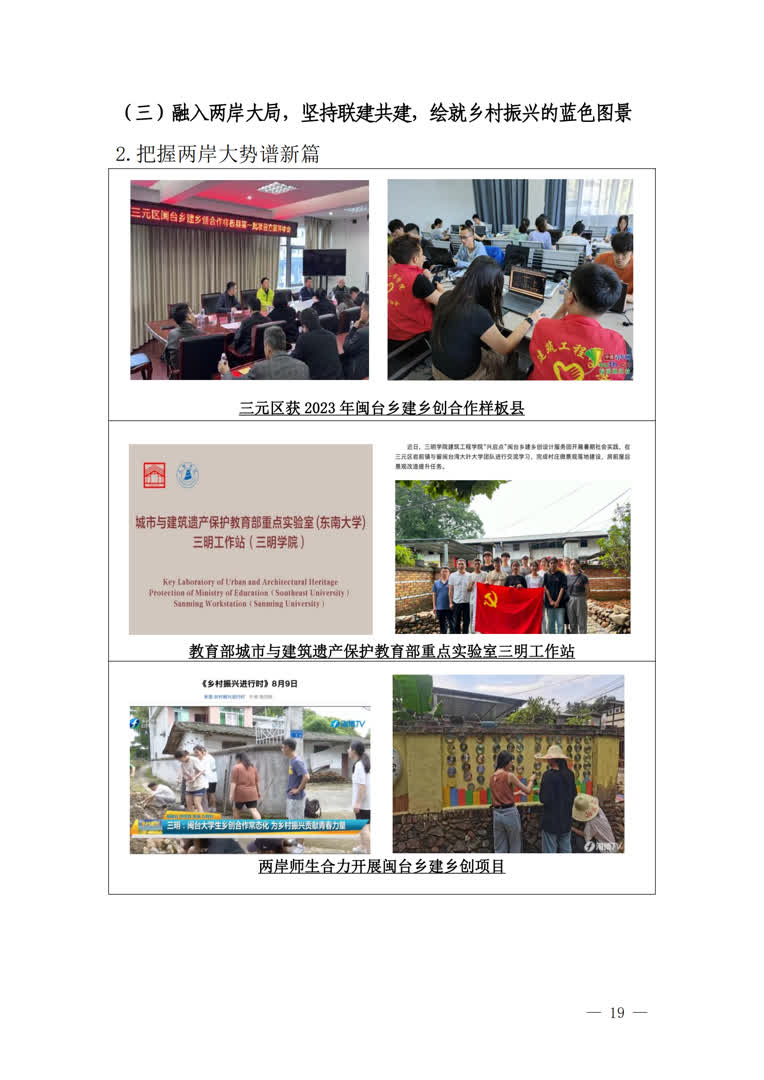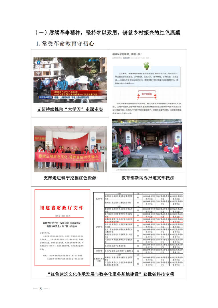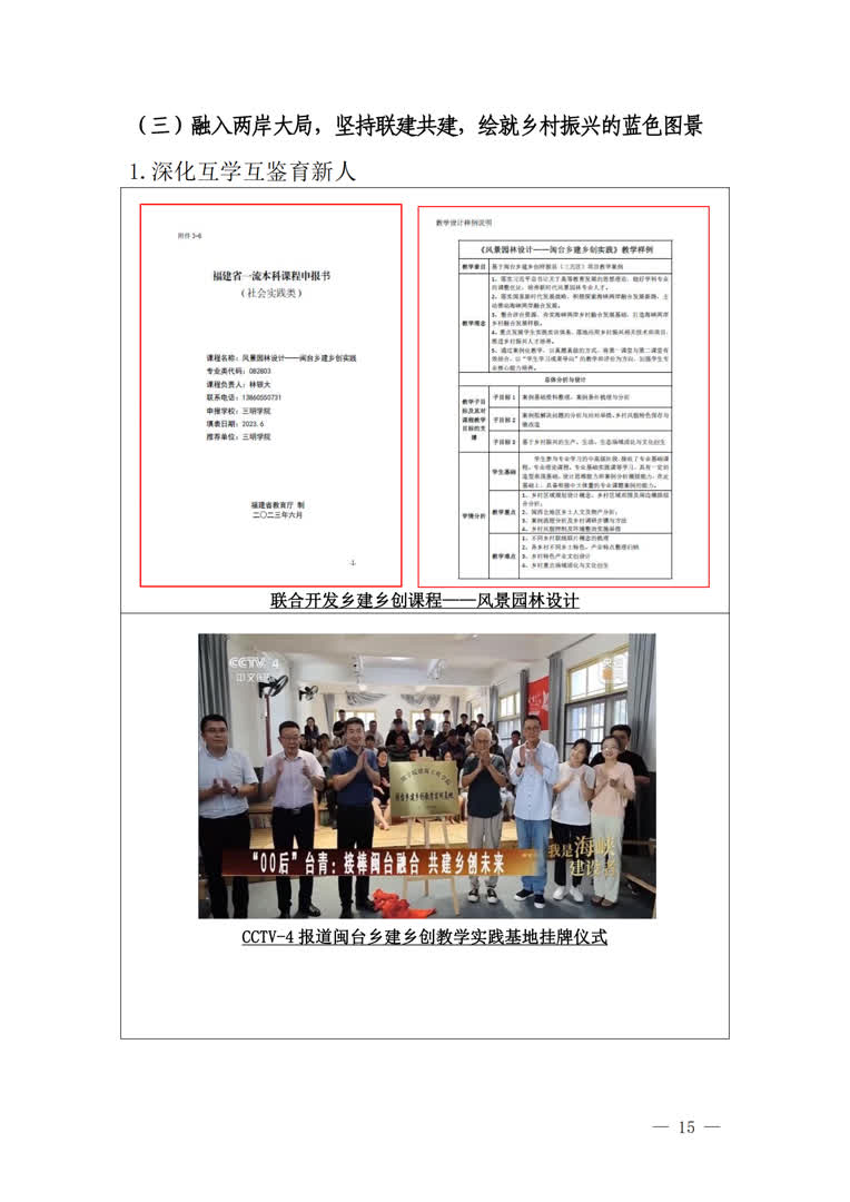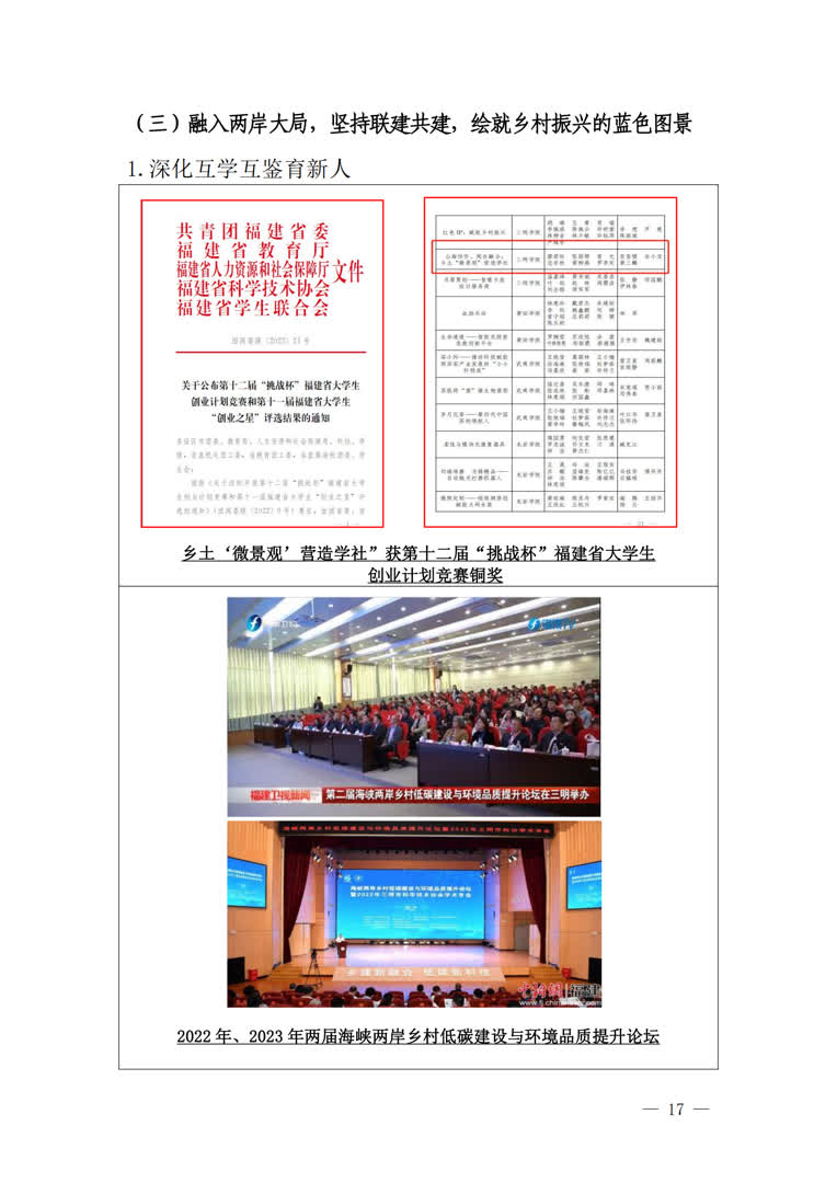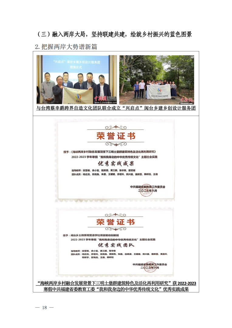 2.把握两岸大势谱新篇。三明是海峡两岸乡村融合发展试验区,风景园林系教工党支部主动与市、区相关部门共建,发起“海峡两岸乡村低碳建设与环境品质提升论坛”,推进闽台在乡村振兴、乡土建筑遗产保护、数字化乡村建设等方面交流合作;挂牌“闽台乡建乡创教学实践基地”,组织师生深入乡村服务融合发展,合力开展闽台乡建乡创项目27个,获准建设“教育部城市与建筑遗产保护教育部重点实验室三明工作站”,助力三元区入选2023年闽台乡建乡创合作样板县(全省仅3个)。“海峡两岸乡村融合发展背景下三明土堡群建筑特色及活化再利用研究”获中共福建省委教育工委“我和我身边的中华优秀传统文化”优秀实践成果。