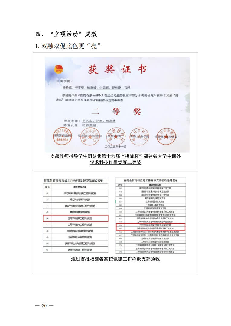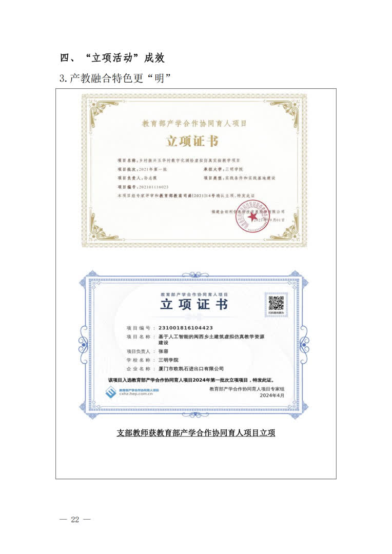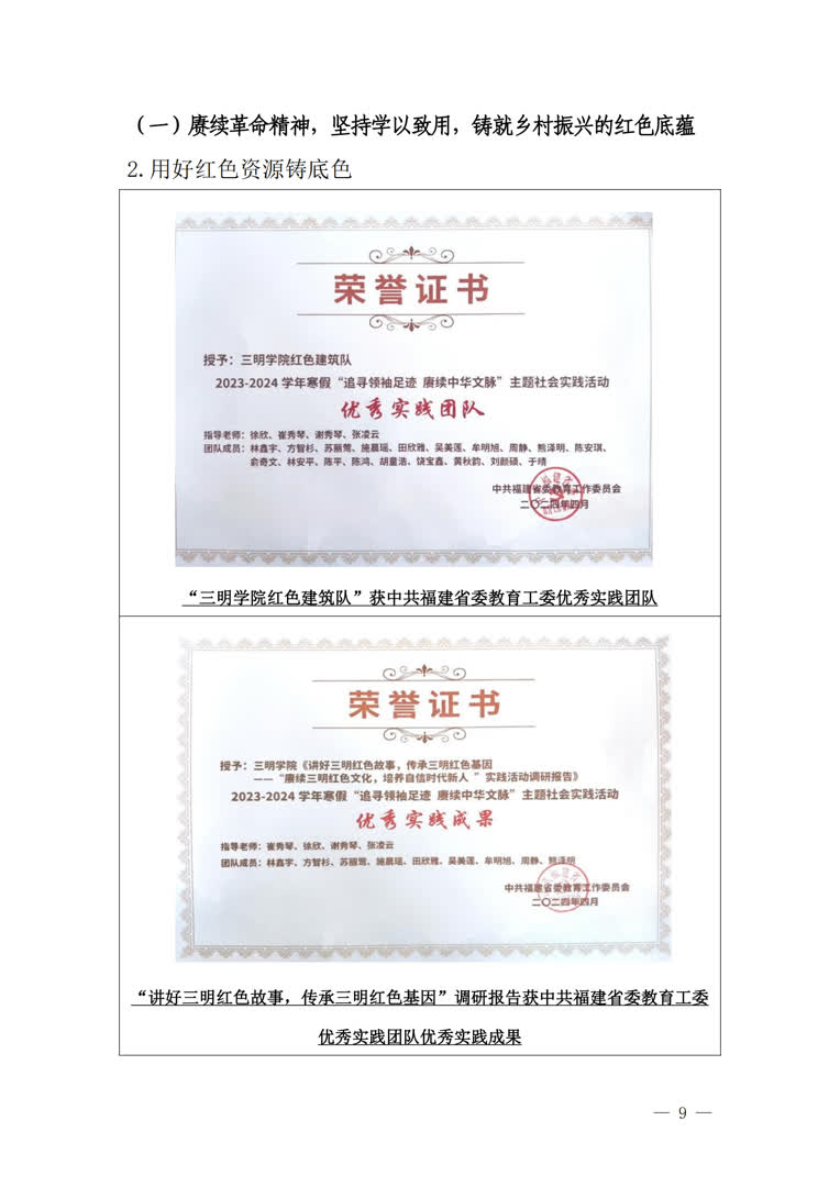 2.实干担当成色更“足”。将三明独特的红色建筑资源调查实践与党员党性修养同步谋划,师生对中华优秀传统文化的理论认同和情感认同显著提升,红色文化活化为党员责任担当和创业精神,获评学校2022年课程思政优秀教学案例。探索形成“三Wei一体”党员创优工程,连续两年获taptap点点网站下载“考研优胜专业”称号,支部书记抓党建工作连续三年获评“优秀”等次,被评为taptap点点网站下载先进党支部,成为“首批福建省高校党建工作样板支部”。2023年获批建设福建省科技专项“福建红色建筑文化传承发展与数字化服务基地”项目,获两项学校研究阐释党的二十大精神专项委托项目,拓展了“首批福建省高校党建工作样板支部”推广成效。