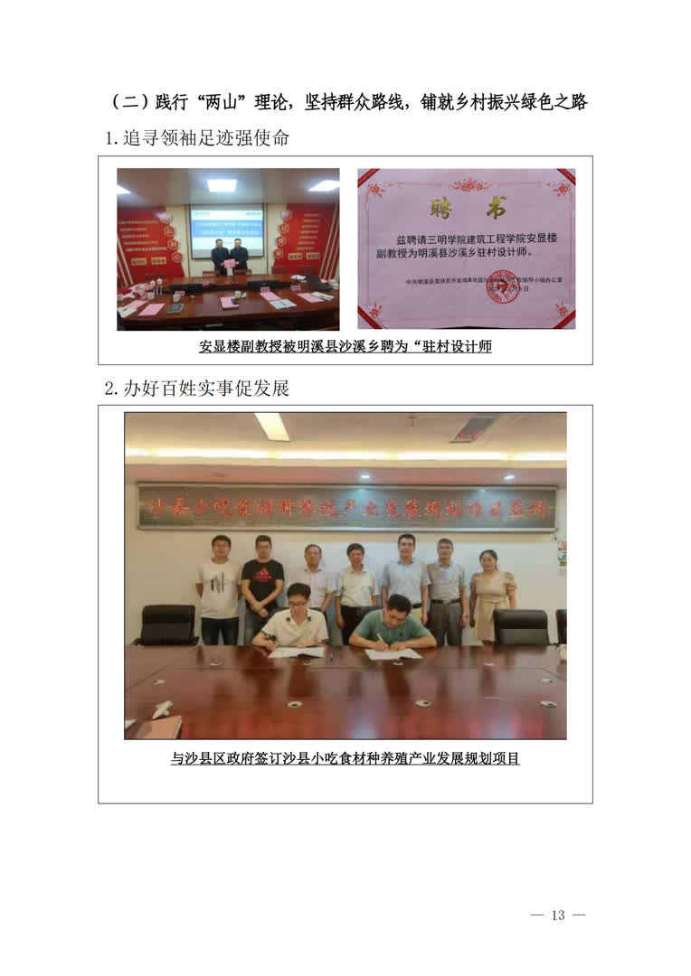 1.追寻领袖足迹强使命。三明是全国生态保护与建设典型示范区,是“两山”理论的孕育地和实践地。风景园林系教工党支部把将乐常口村、沙县俞邦村等“网红”乡村作为师生党员的现场教学点和专业见习实践地,连续开展“追寻领袖足迹,感悟思想伟力”“追寻习近平福建足迹——闽山闽水物华新”教育实践活动,调研新时代老区苏区乡村的变化、需求和未来发展路径,深刻领悟“两山”理论真谛,沿着“两山”理论的指引为当地乡村振兴提出合理化意见建议。如刘新炜教师团队撰写的《优化三明主城区绿化空间格局促进建设“绿色生态之城”》调研报告获市政府主要领导肯定性批示。