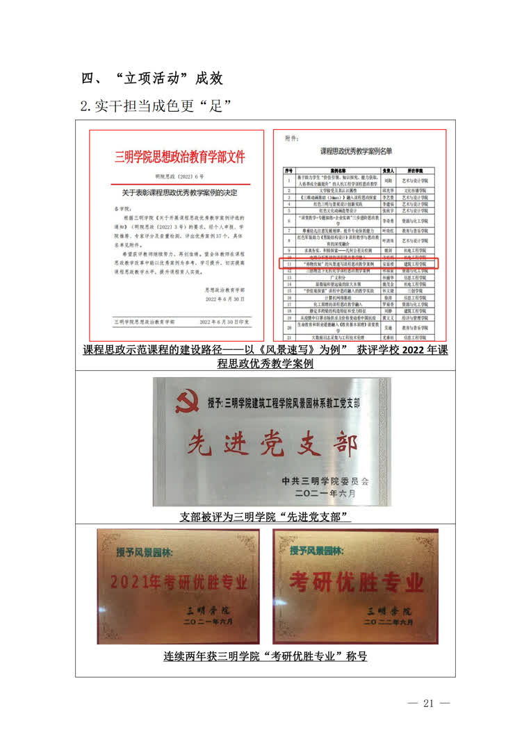 1.双融双促底色更“亮”。将党建“执笔”与风景园林专业人才培养一体设计,探索形成“君子人格,工匠精神”的大思政育人模式。红色建筑文化传承、乡村景观营造服务、乡建乡创交流合作等实践成果丰硕,学生团队获第十六届“挑战杯”福建省大学生课外学术科技作品竞赛二等奖,获4项外观专利,“taptap点点网站下载红色建筑队”项目组和“讲好三明红色故事,传承三明红色基因”调研报告分别获中共福建省委教育工委优秀实践团队和优秀实践成果。