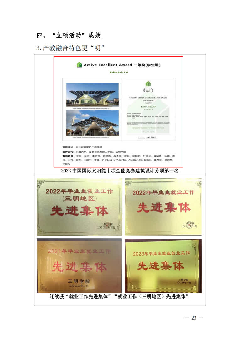 3.产教融合特色更“明”。将地方产业方向与专业发展优势深度结合,“知识赋慧”“技术赋能”“育苗赋兴”的产学研用的人才培养模式逐步形成,服务地方能力显著增强。获3项教育部产学合作协同育人项目立项,获2022中国国际太阳能十项全能竞赛建筑设计分项第一名,“阳光方舟Solar Ark 3.0”项目获第二届全国生态混凝土创新设计应用大赛一等奖。“闽台乡土微景观营造学社”等10余个项目驱动创新班培育建筑工匠4000人次。就业创业质量稳居学校前列,连续获“就业工作先进集体”“就业工作(三明地区)先进集体”荣誉。创新做法和成效被央视新闻、教育部官微、福建新闻联播、中国新闻网等平台专题报道20余次。