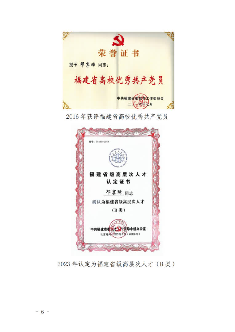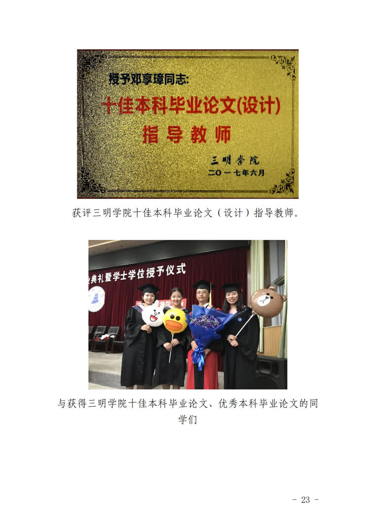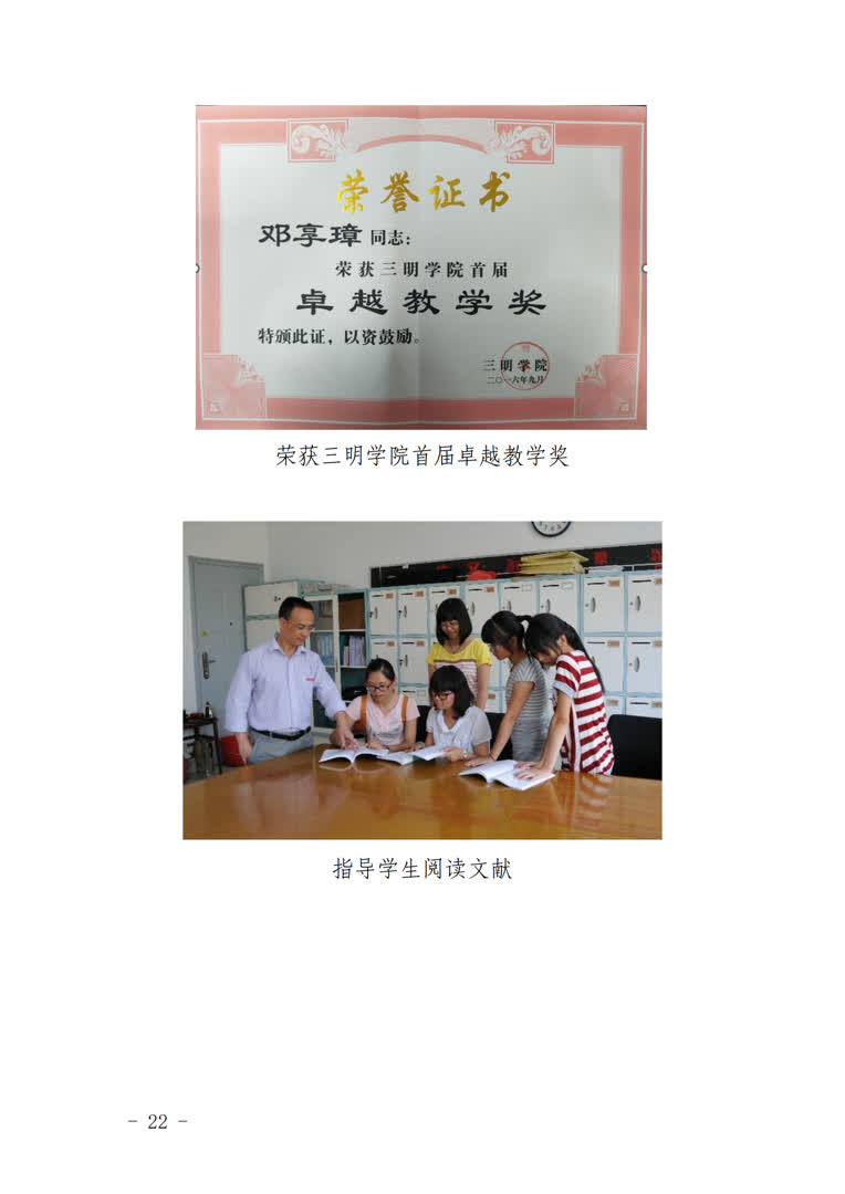 作为一名有着30年党龄的老党员,作为中国语言文学学科带头人,邓享璋发挥领头羊作用,响应教育部关于加强国家通用语言文字教学要求,调整学科方向,推动有组织的教学科研,近年来组织自编《普通话教程》等7部教材,开设《魅力表达轻松学》等数十门课程,学生获省级以上诵写讲奖项179项,被教育部、国家语委、福建省教育厅授予诵写讲大赛“优秀组织单位”3次。
