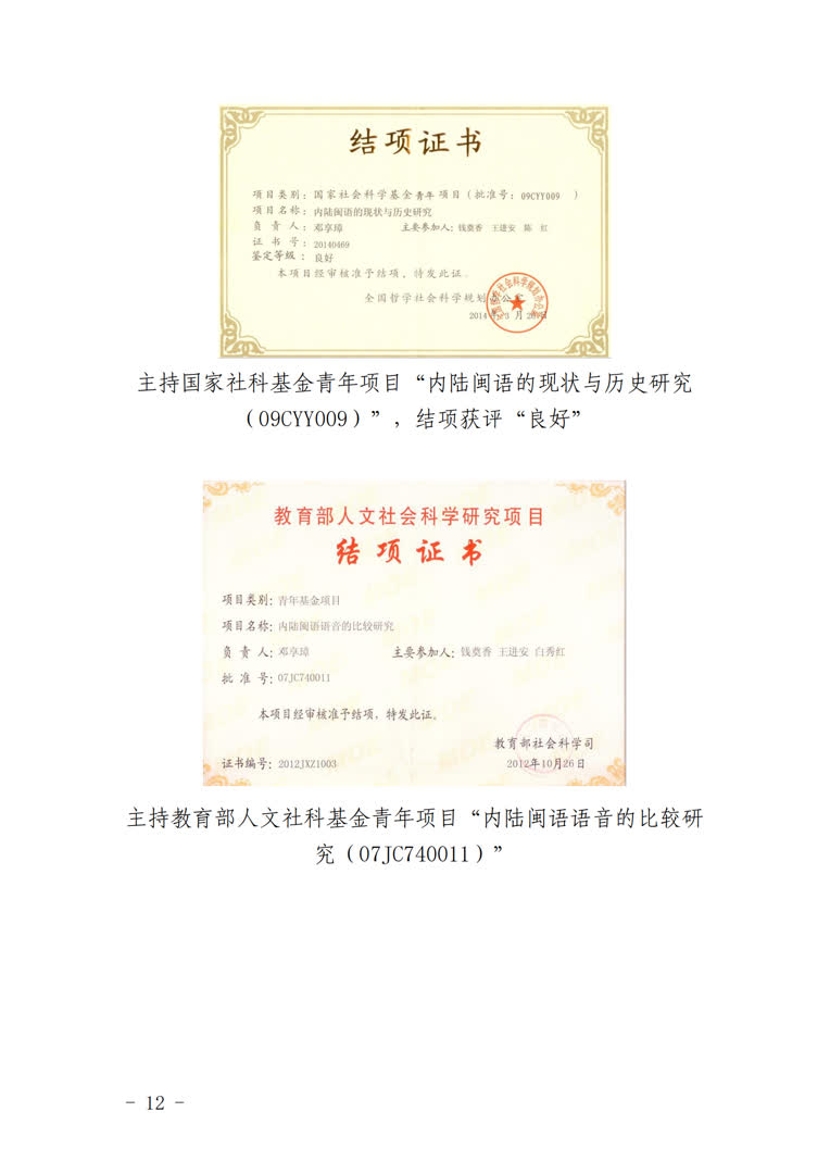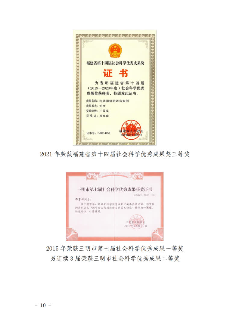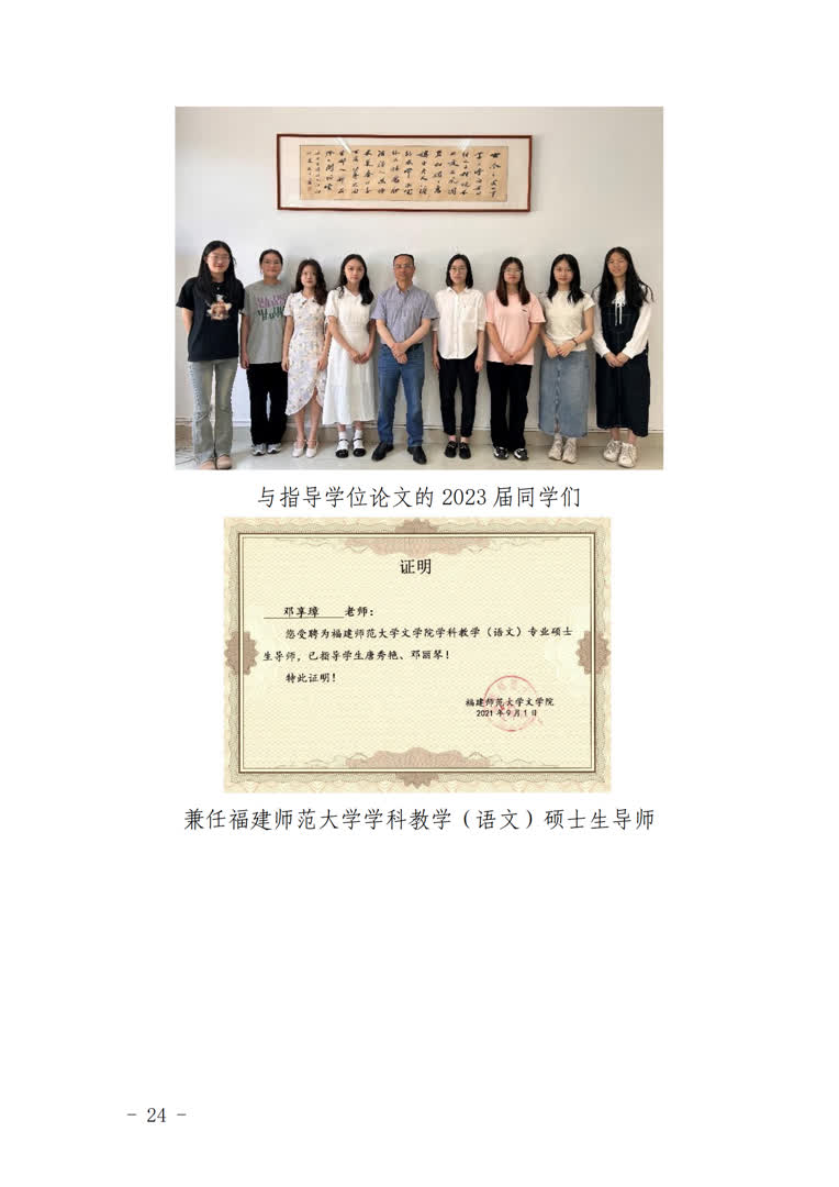 近几年来,邓享璋所在的学科团队获国家社会科学基金项目4项、省部级项目8项、出版专著5部,助力学校2023年12月获批国家语言文学推广基地,这也是当年福建省获批的唯一一个国家语言文学推广基地。