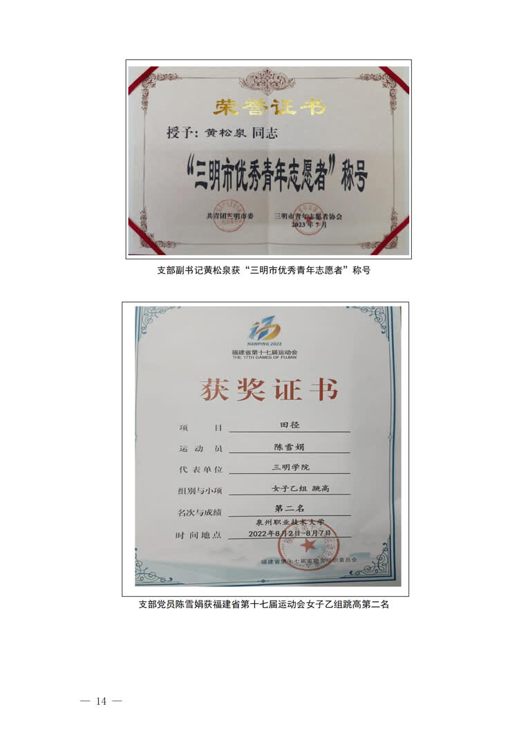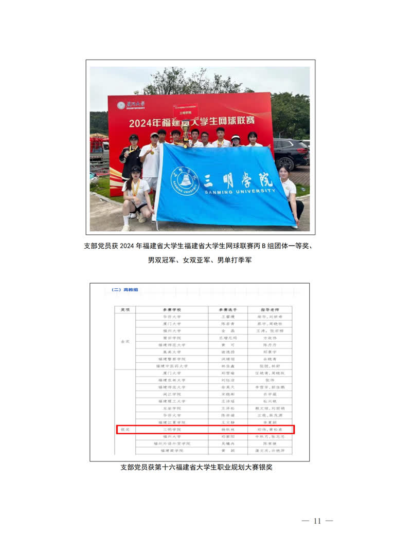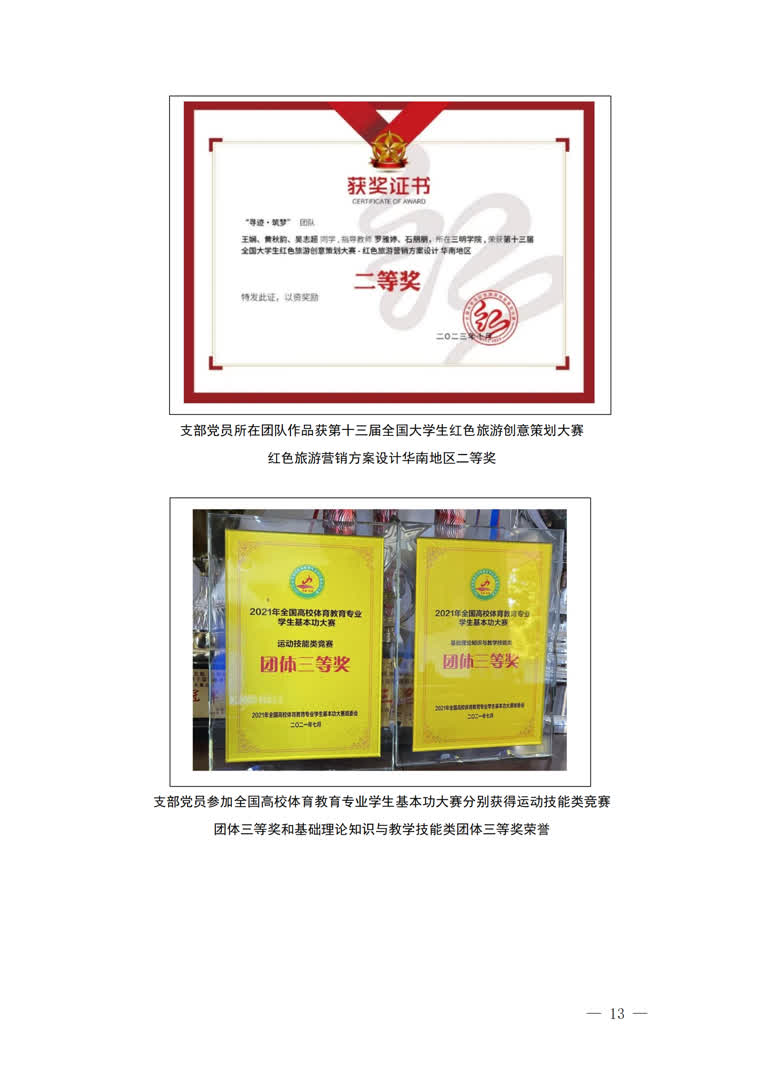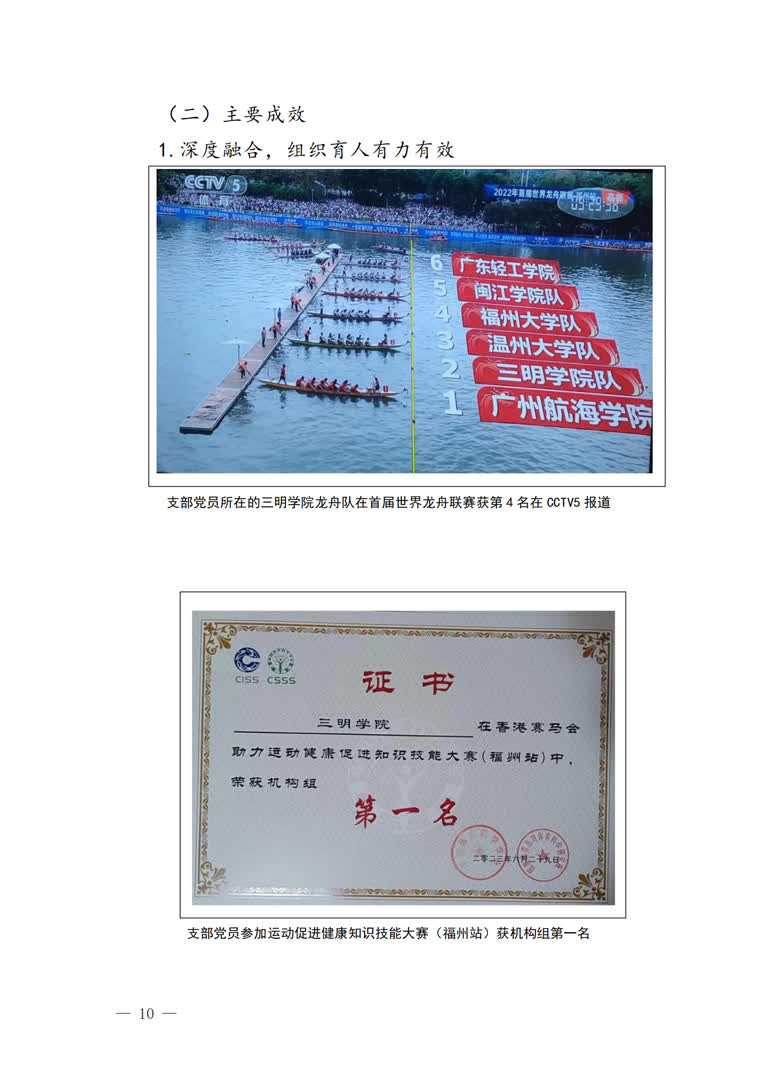 1.以体为本,思想与学业并进。将支部建设与人才培养、专业建设深度融合,帮助党员从思想到行为、从理论到实践都得到历练,综合素养得到有效提升,形成“人人有获奖、人人有事做、人人有贡献”的良好局面。落实高质量就业,2022和2023届毕业生党员均实现100%就业,共有35人考研升学、教招上岸。近2年,上百人次在首届世界龙舟联赛、福建省运动会(大学生部)、大学生职业生涯规划等省级及以上赛事中获奖。