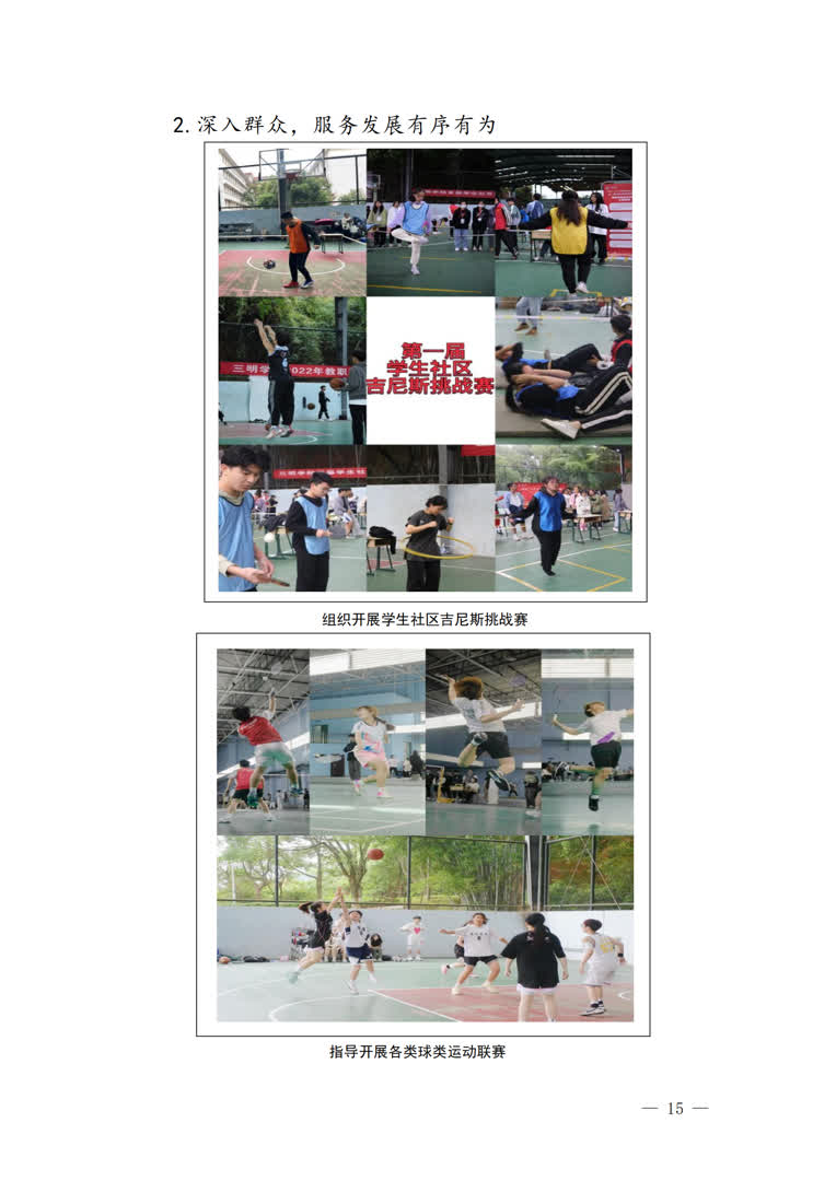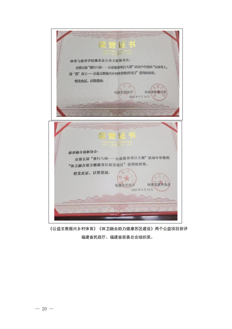 2.以体为用,实践与服务协同。延伸校内,实现党员进社区、班级、部门、社团(协会)和训练队范围的全覆盖,打通了服务群众的“最后一公里”。指导开展12项大型体育赛事600余场,浓厚“周周有训练,月月有比赛”校园体育文化氛围,帮助学校入选全国首批健康学校创建单位。辐射校外,连续3年开展“体育助双减”、体质健康测试和姚基金公益支教等志愿服务项目,为体育强国和健康中国建设贡献青春力量。两个公益项目获评福建省民政厅、福建省慈善总会组织奖。