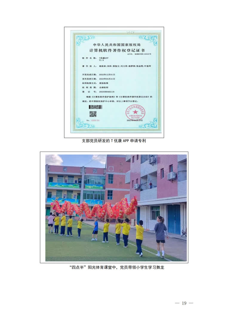 (1)助老助残筑“幸福梦”。开展“青暖夕阳”社区敬老志愿服务项目,坚持每月到社区为老人宣讲康养知识、传授康养手法。近两年已开展25场敬老活动,覆盖近1000名老人。开展“提灯计划”助残项目,到三明市特殊教育学校义务开展舞龙舞狮、健美操等项目教学,进一步促进“普特融合”。支部党员研发“T优康”APP,注册人数超上万人,成功帮助6名盲人按摩师顺利就业。