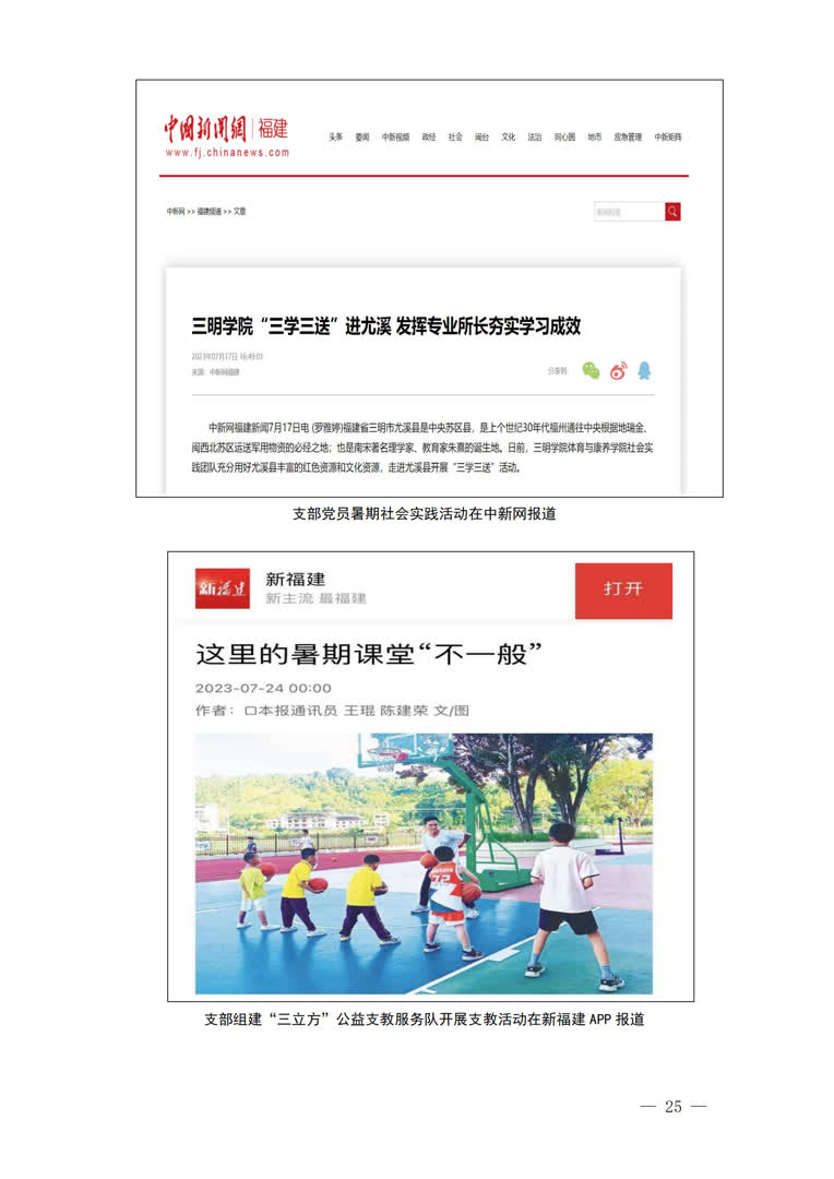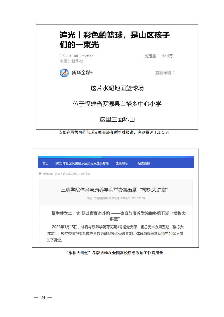 3.以体为魂,党建与育人融合。立足专业实际特色,支部坚持以党建为引领,以“党建+人才培养”为抓手,不断创新工作思路,探索“以体育人”新模式。双培工作案例入选全省高校“一融双优”基层党建工作模式典型案例,《体育院系“三立方”组织育人的创新与实践》获全省党建教育系统重点课题调研报告三等奖。“冠军宣讲团”连续2年入学全国大学生青年志愿者宣讲团,“楼栋大讲堂”、公益支教等品牌活动得到新华社、全国高校思想政治工作网的报道,篮球支教事迹浏览量达152.5万。